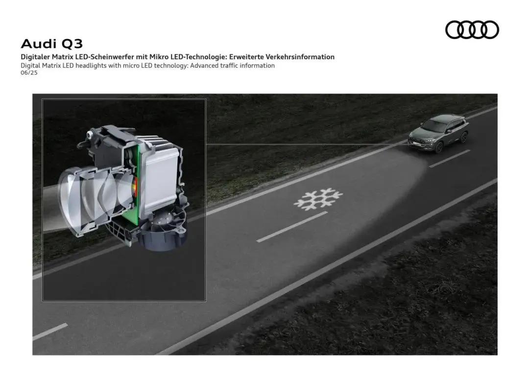 2025年6月17日,第三代全新奥迪Q3发布,采用全新的奥迪设计语言。延续了品牌标志性的六边形进气格栅,但内部结构调整为蜂窝状网格,搭配分体式LED头灯组,视觉上更显年轻化。