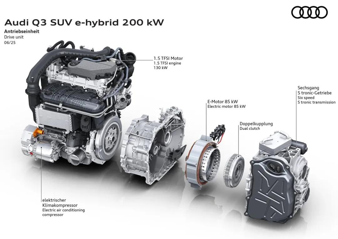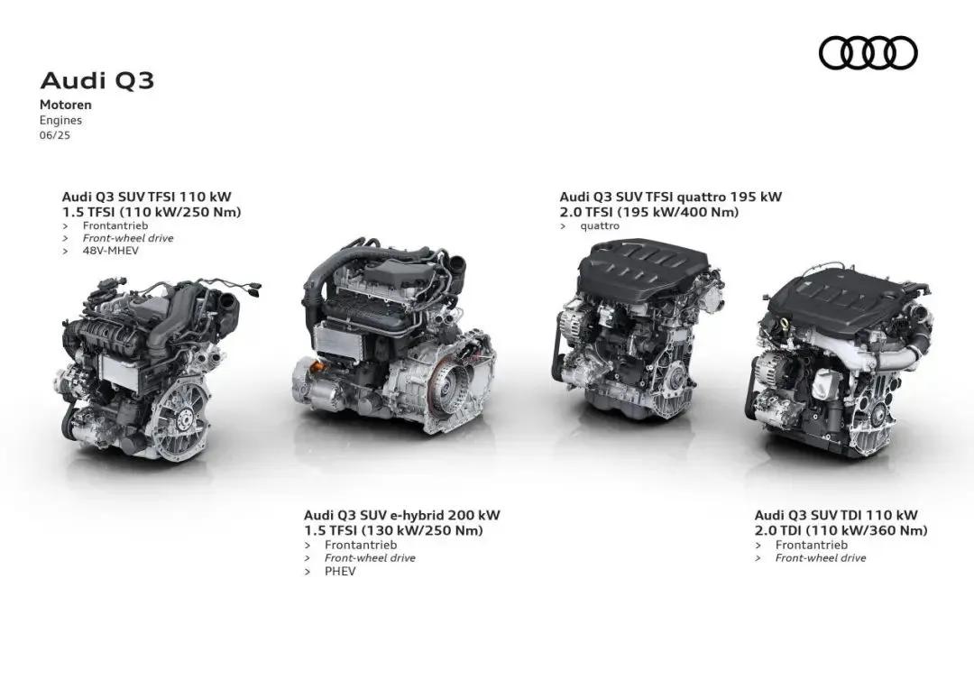 第三代Q3提供1.5T轻混、2.0T高低功率及插电混动(PHEV)多种动力组合。