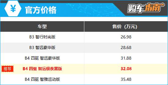 在全系车型中,我们特别推荐的是指导价为32.08万元的B4 四驱 智远极夜黑版。通过配置对比可以看出,推荐车型相比较低一级车型,更换为尺寸更大的20英寸轮毂,并加入了运动外观套件,视觉上更为个性时尚。同时座椅材质也从仿皮升级为皮/翻毛材质混搭,价格仅比较低一级车型多了0.2万元,可谓物超所值。