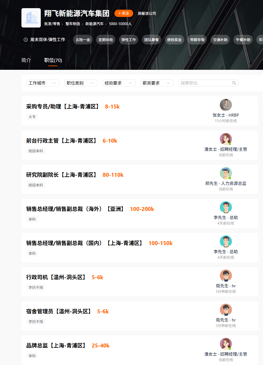 值得注意的是,与此同时,在第三方招聘网站上出现了大量关于翔飞汽车的招牌信息。上到年薪200万元的研究院副院长、销售总经理,下到月薪4000元行政司机、人力资源助理,俨然一幅重整旗鼓的模样。