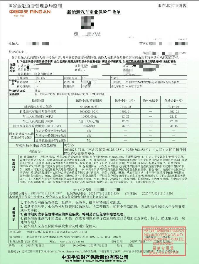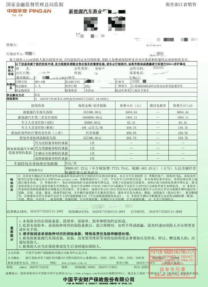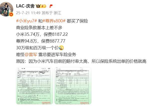 7月21日,一位同时购买了小米YU7和尊界S800的博主在社交媒体上晒出了这两款车型的保险费用。令人震惊的是,30万级的小米YU7和百万级的尊界S800保险费居然差不多。