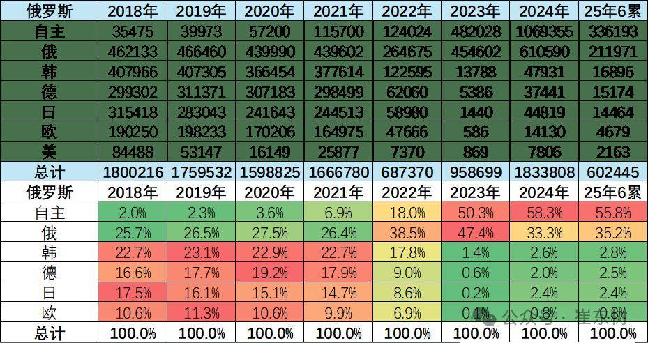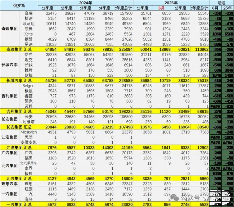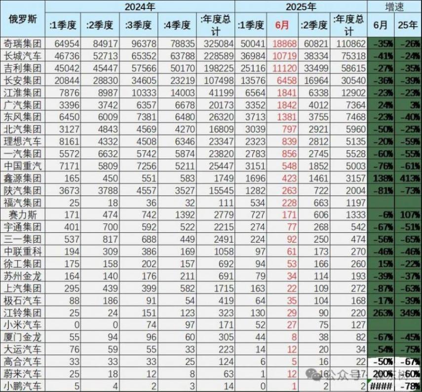 2023年中国出口俄罗斯100万辆车,自主的俄罗斯市场销量48万辆,销量是中国自主出口量的48%。2024年中国出口俄罗斯128万辆车,自主的俄罗斯市场销量107万辆,自主的俄罗斯市场销量是中国自主出口量的84%。2025年1-6月中国出口俄罗斯18万辆车,自主品牌俄罗斯销量34万辆,当地销量是中国出口的187%,终于实现了大幅去库存的走势,化解风险。