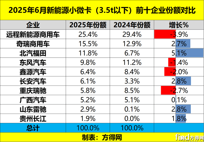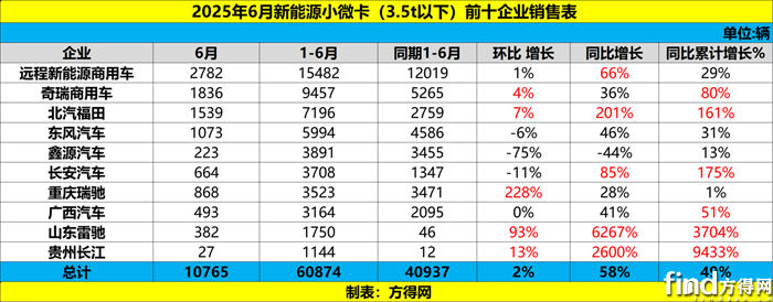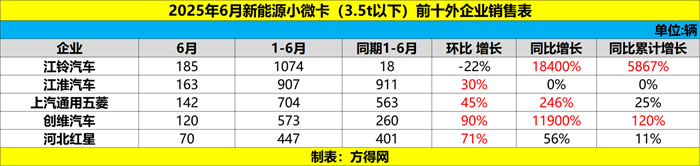 2025年6月,在新能源小微卡同比增长58%、环比微增2%的背景下,哪些企业有着超越行业的表现?