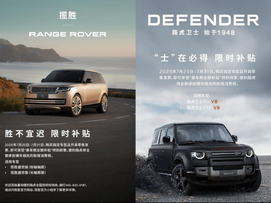 这么算下来,其实也相当于车价变相涨了十几万,这对于很多购买入门豪车的老板也是一笔不小的数目,那么为了能够留住老板们的订单,自然就需要厂家推出更大幅度的优惠,就针对旗下揽胜、卫士推出限时补贴,7月31日前购买指定车型并开具零售发票,经销商便可承担裸车相关的新增消费税,其中就包括揽胜盛世版的标轴和长轴车型,以及卫士90和卫士110的V8车型。