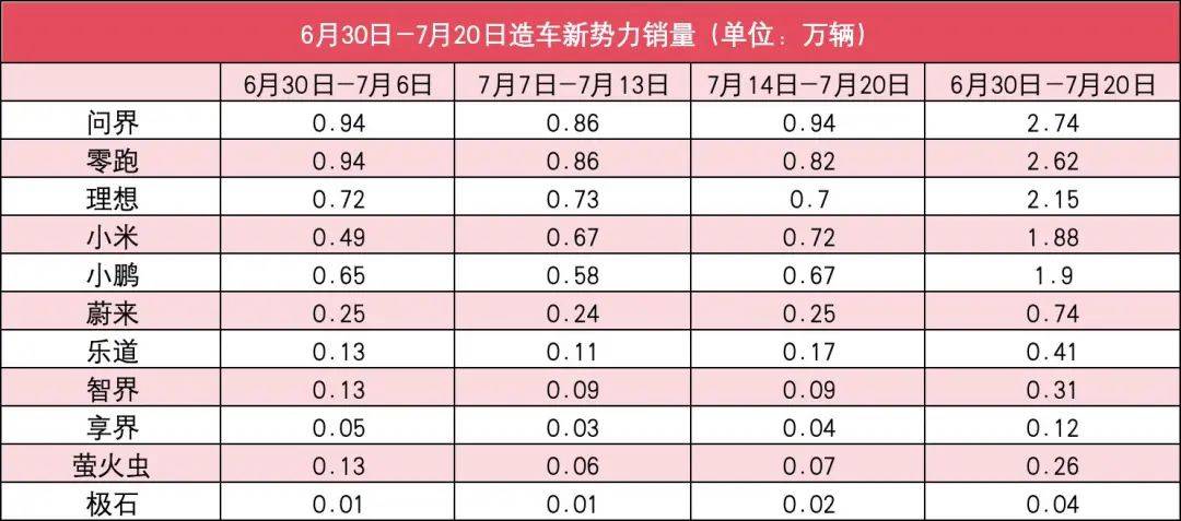新势力7月第3周销量榜:小米竟超理想,尊界超100辆!蔚来回血