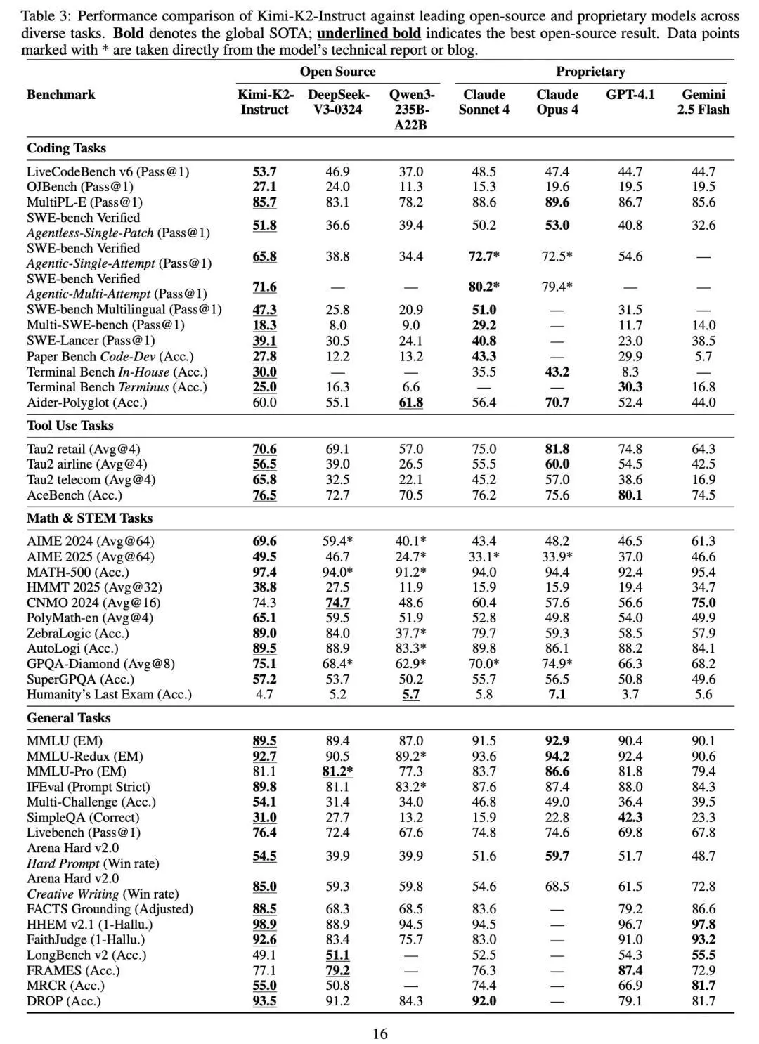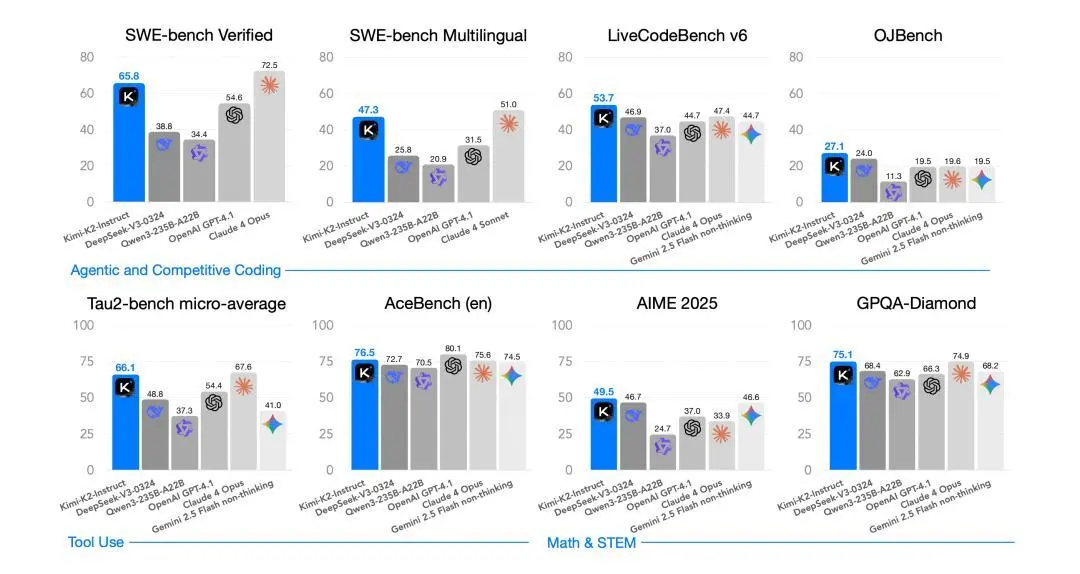 Kimi K2 在代码、数学、工具使用和长文本四项关键能力上均取得或逼近当前开源模型的最优成绩,并在多项任务上超越闭源标杆。
