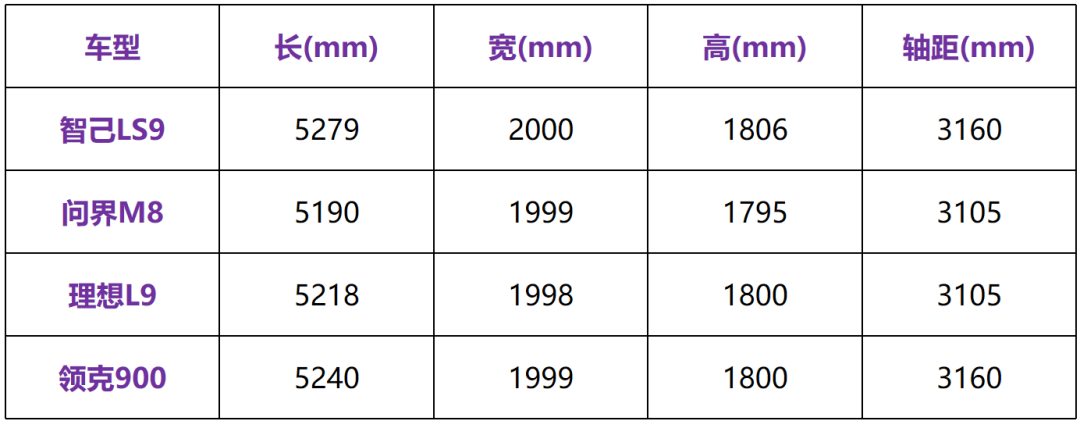 尺寸方面,智己LS9的轴距和长、宽、高,都完全压制了问界M8、理想L9和领克900,是妥妥的D级大型SUV。