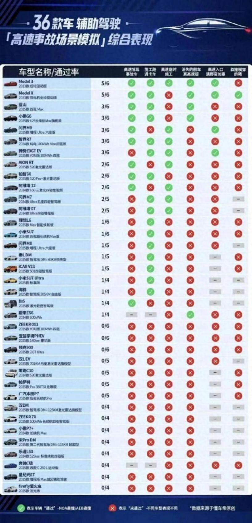 懂车帝的一场大规模智驾测试,在汽车行业投下一枚深水炸弹。36款车型高速场景测试、26款车型城市场景测试,覆盖特斯拉、华为问界、小米SU7等主流品牌,模拟15类高危事故场景。
