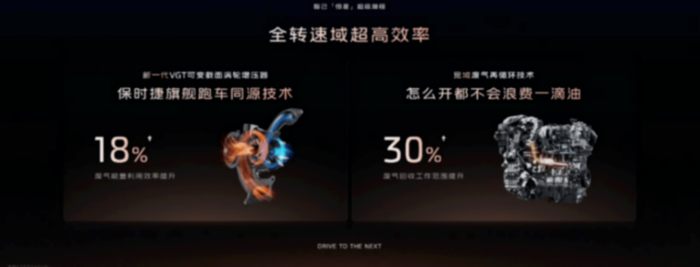 动力性的问题上,“恒星”超级增程匹配了 Zephyr 1.5T 增程专属超效黄金发动机,应用了保时捷同源的 新一代 VGT 可变截面涡轮增压器 ,可以进一步提升发动机高转速功率和低转速扭矩,让发动机在全转速域都能实现超高的燃烧效率, 将废气能量利用效率提升 18% 。