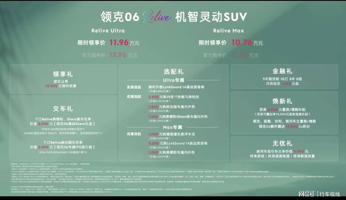 为让年轻用户轻松拥抱精致,领克06 Relive 推出多重限时购车权益:8月5日 - 8月31日购车,立享10000元现金优惠,专享价10.76万元起。