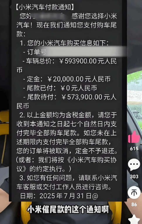 事情是这样的,在8月初,多位小米SU7和SU7 Ultra准车主在社交平台发声:车辆尚在排产阶段(最长等待周期达41周),却突然收到小米交付顾问通知,要求7天内结清20万-50余万不等的尾款,否则订单取消且定金不退。