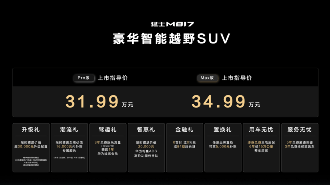 此次上市的猛士M817共有两个版本:Pro版指导价31.99万元,Max版指导价34.99万元。值得一提的是,凡从即日起至9月30日下订的用户,可享至高价值超7万元的8重首销专属权益,包括3年免费娱乐流量、0首付/0利息金融方案、任意品牌置换5000元补贴、终身免费三电质保等,可谓“诚意拉满”。