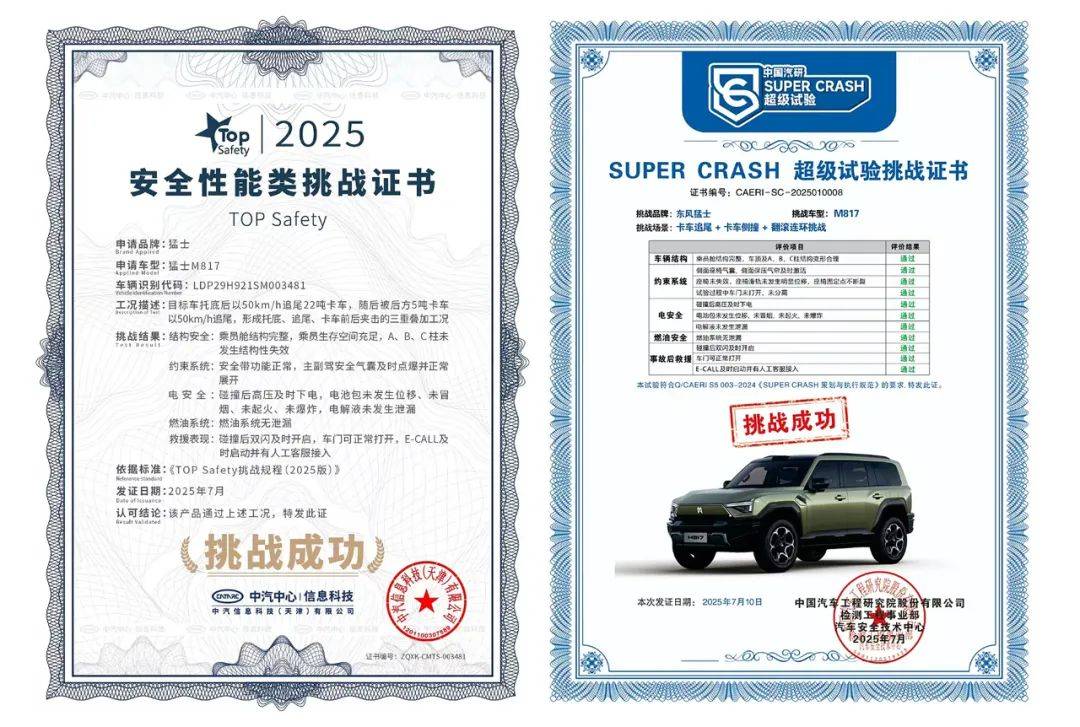 电池安全方面,猛士817采用的宁德时代越野专用电池搭配“9层电池包+1300MPa钢板”10层防护,通过10倍国标振动、200倍国标浸水测试;智能BMS系统24小时监测,磕碰、涉水时电池安全有保障,还拿了中汽中心NESTA六维电安全认证。