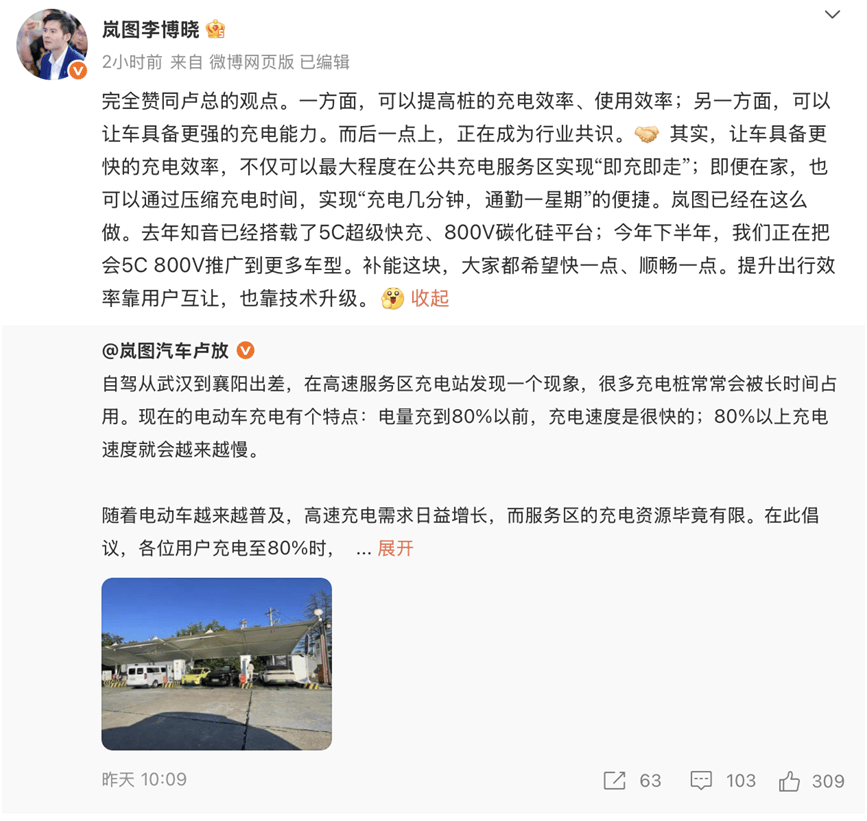 岚图销售公司副总经理李博晓指出,“一方面,可以提高桩的充电效率、使用效率;另一方面,可以让车具备更强的充电能力,这一点正在成为行业共识”。他也表示,等车型已搭载800V平台并支持5C超充,让用户真正体验“充电如加油”的便捷。同时还透露,今年下半年,岚图将把800V+5C推广到更多车型。