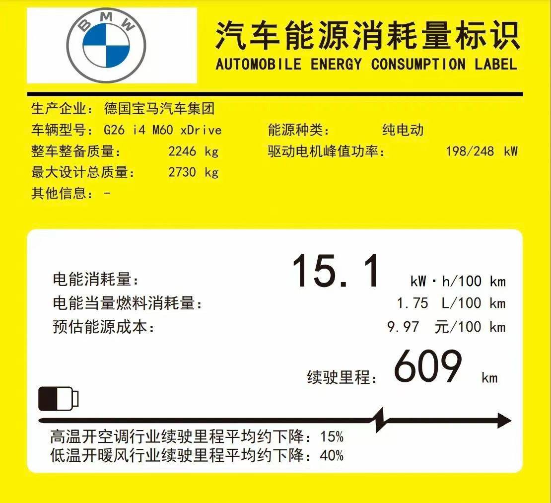 近日,工信部备案信息显示,宝马新车——i4 M60 xDrive已完成国内能耗标识申报,续航里程首次公布为609公里,电耗亦首次公布为15.1千瓦时/百公里