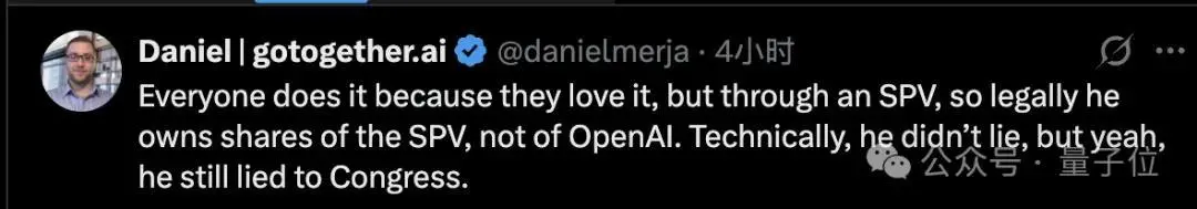 有投资者指出,严格地说奥特曼持有的股份通过SPV(特殊目的载体)实现,从法律意义上讲确实不算OpenAI的股份。